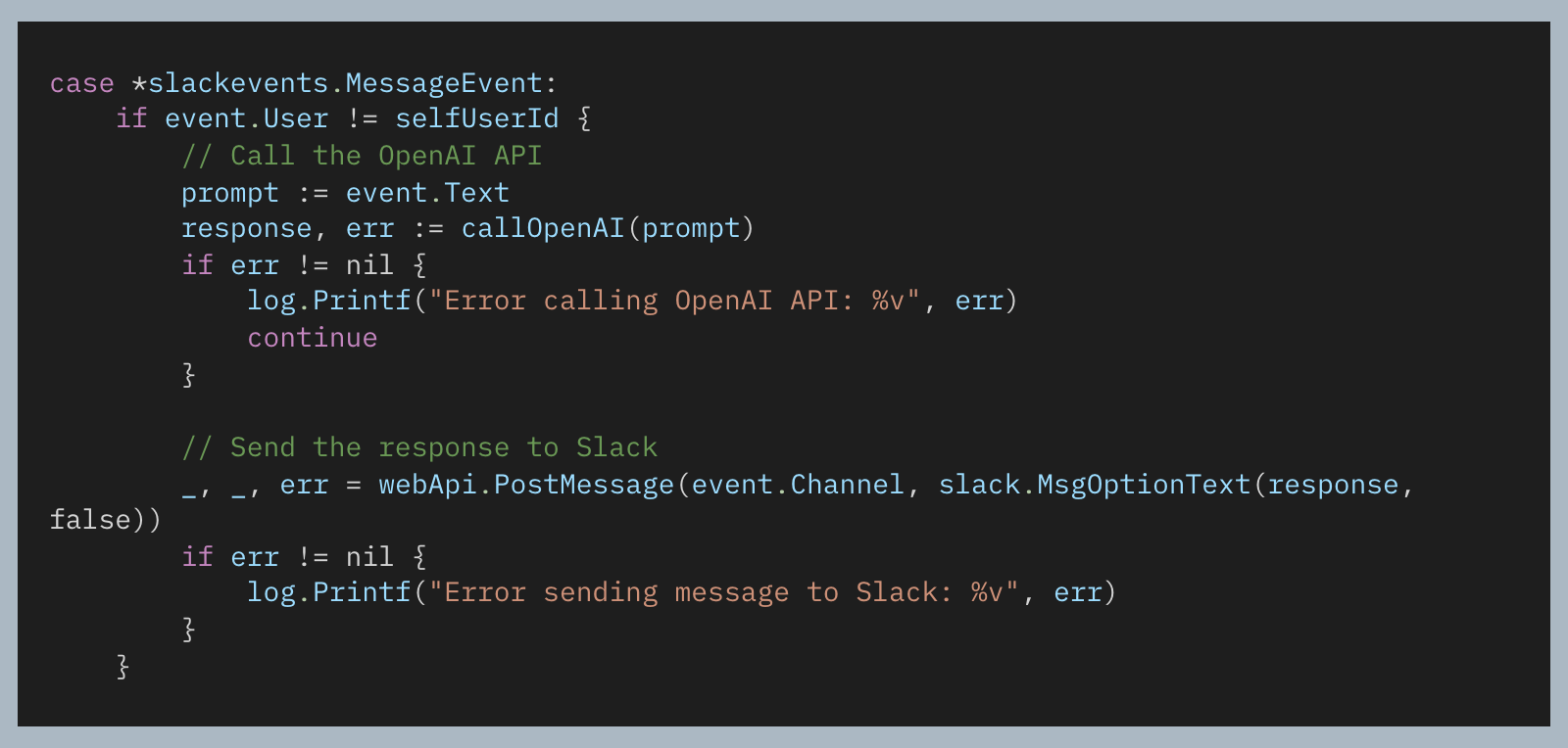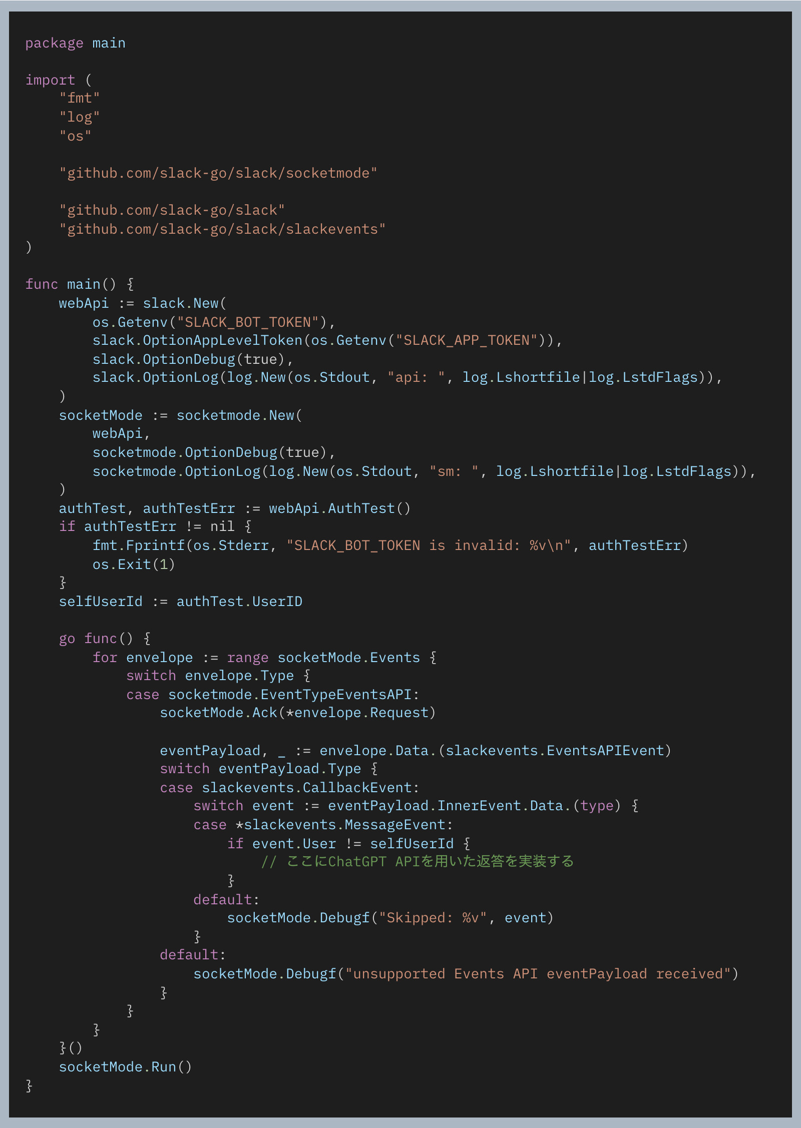 以上のコードは、ユーザからのメッセージをOpenAIのAPIに送信し、得られた応答をそのまままSlackに投稿するものです。このコードを含むためには、以下のパッケージの追加が必要になります:
