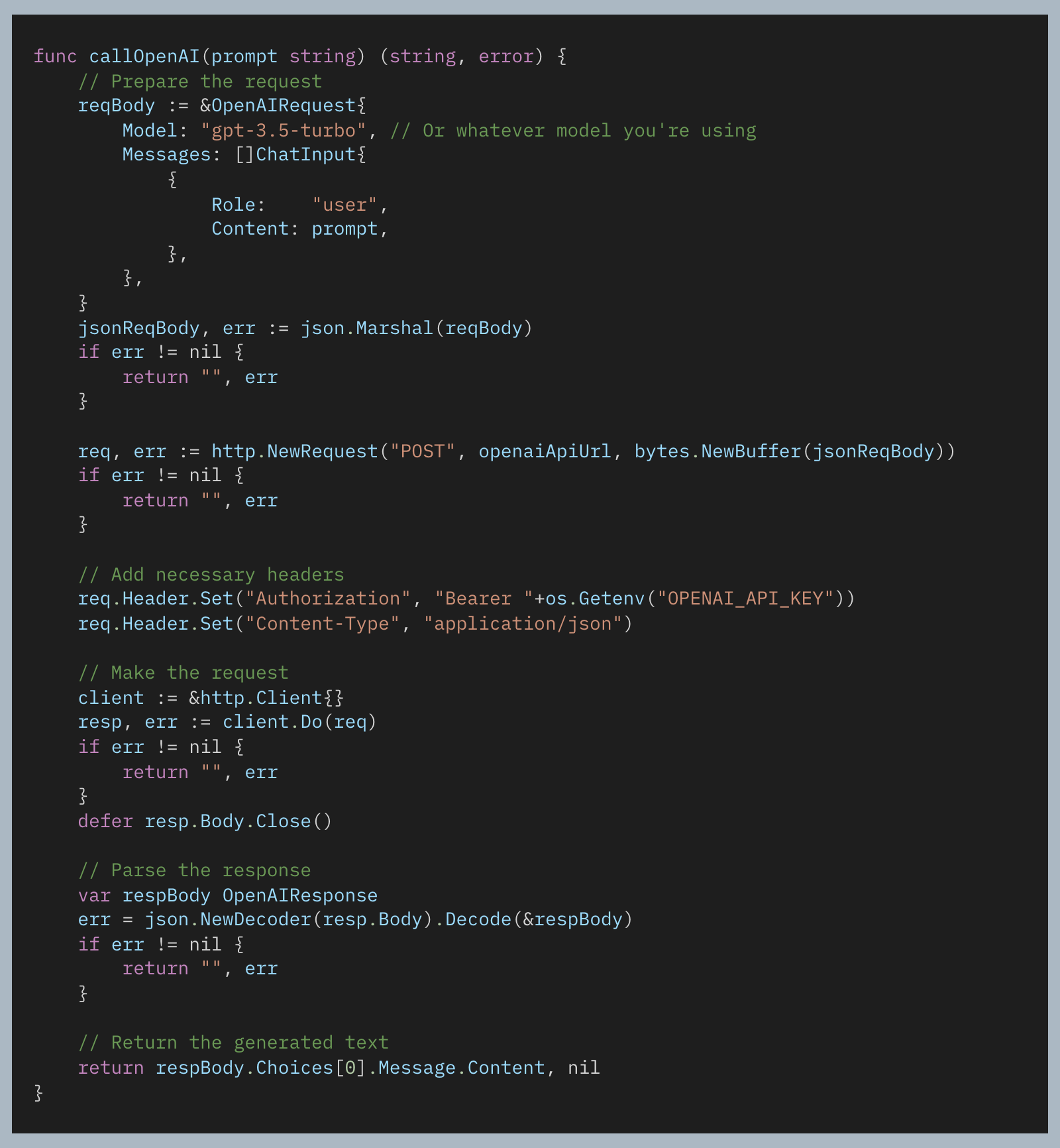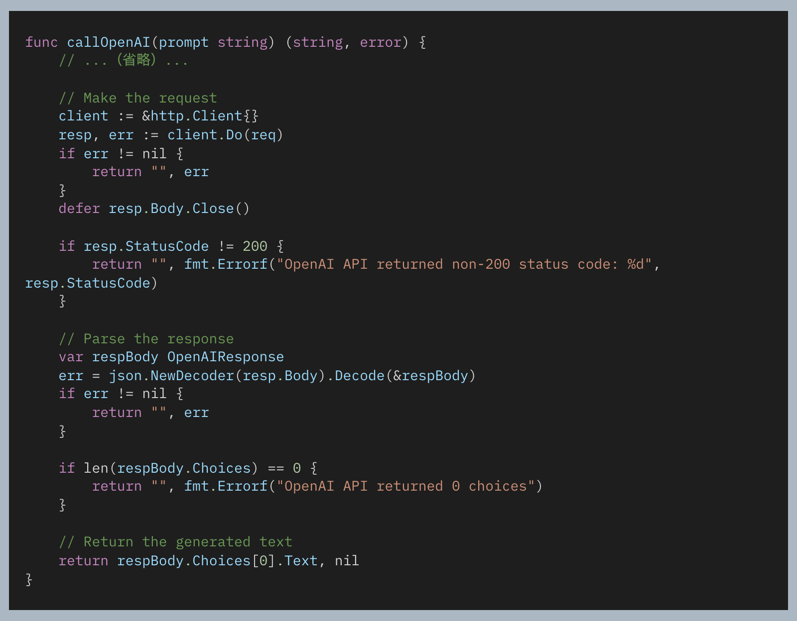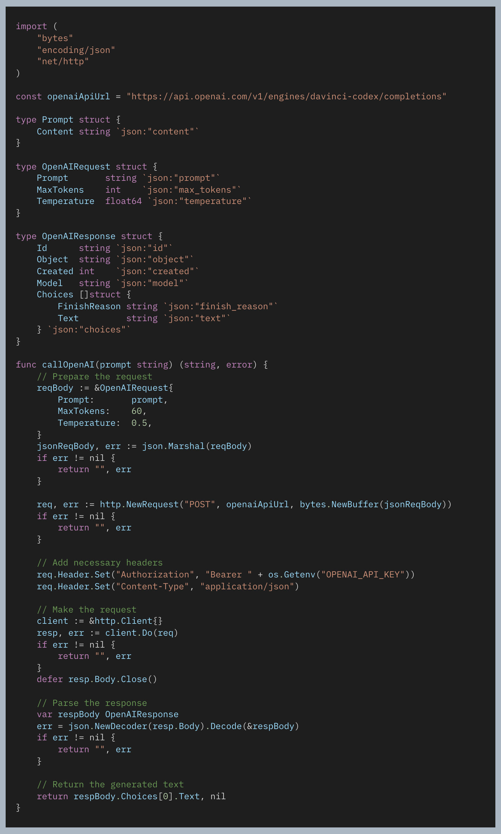 OpenAIのChatGPT APIを使って返答を作成するためには、まずOpenAIのGPT-3 APIを利用するためのクライアントライブラリが必要です。Go言語用の公式ライブラリは現在存在していないので、ここでは直接HTTPリクエストを発行してAPIを呼び出します。そのため、net/httpとencoding/jsonパッケージを使用します。 まずはChatGPT APIにリクエストを送信する関数を定義しましょう:![]()