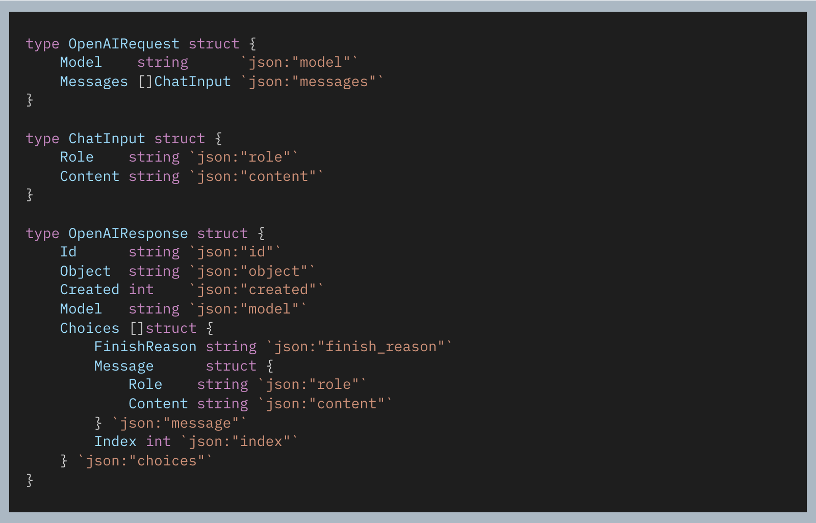 最新のOpenAI Chat APIに基づいて、あなたのコードを更新する必要があります。 まず、リクエストとレスポンスの構造体を修正します。 以下のように、OpenAIRequestとOpenAIResponseの定義を更新します。次に、